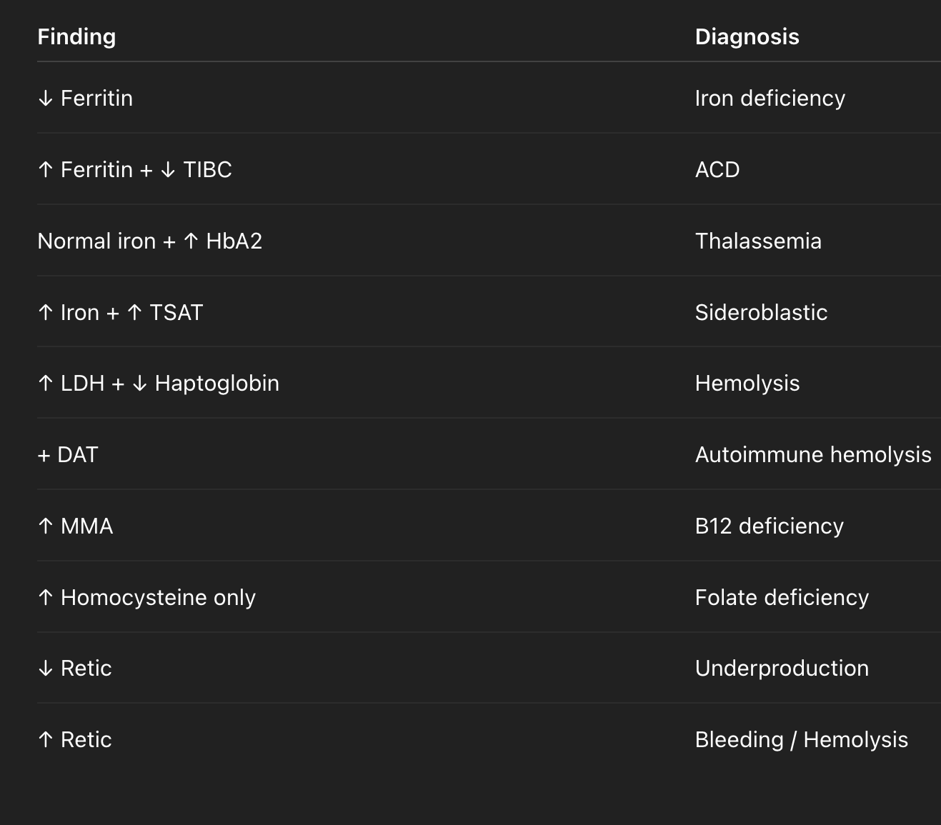 -- Anemia of chronic disease (Normal/↑ ferritin, ↓ serum iron, ↓ TIBC, ↓ transferrin saturation) (CKD, infection, cancer, autoimmune) -> tx CKD (EPO),Tx underlying cause