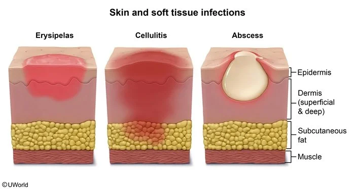 -- DDX: erysipelas, pyomyositis, necrotizing fasciitis, osteomyelitis, venous stasis
